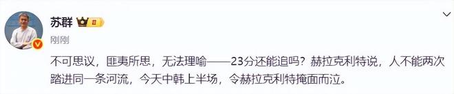 到整个半场结束人家韩国队直接52-29领先,这个分数就连苏群都忍不住了,直接发文表示不可思议。