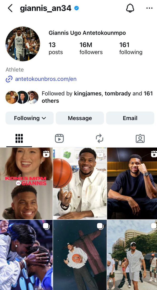 而最后说到社交媒体内容,今天还有另外一单颇大的消息,字母哥已经清空了他INS上所有关于雄鹿队的内容,只留下了广告推广以及家人类照片。