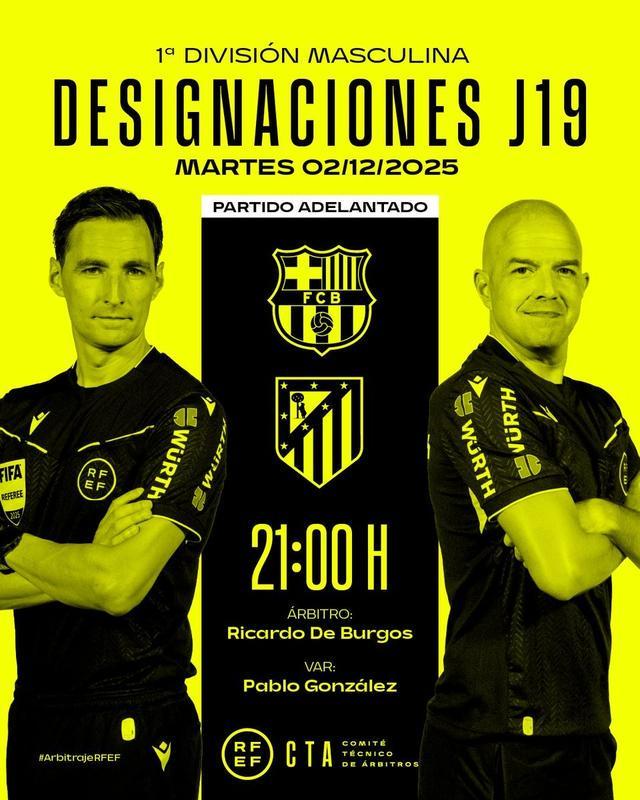 官方消息,西甲第19轮巴萨vs马竞裁判名单公布,布尔戈斯担任主裁,巴勃罗-冈萨雷斯担任VAR。